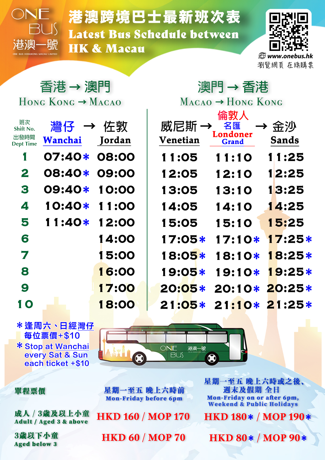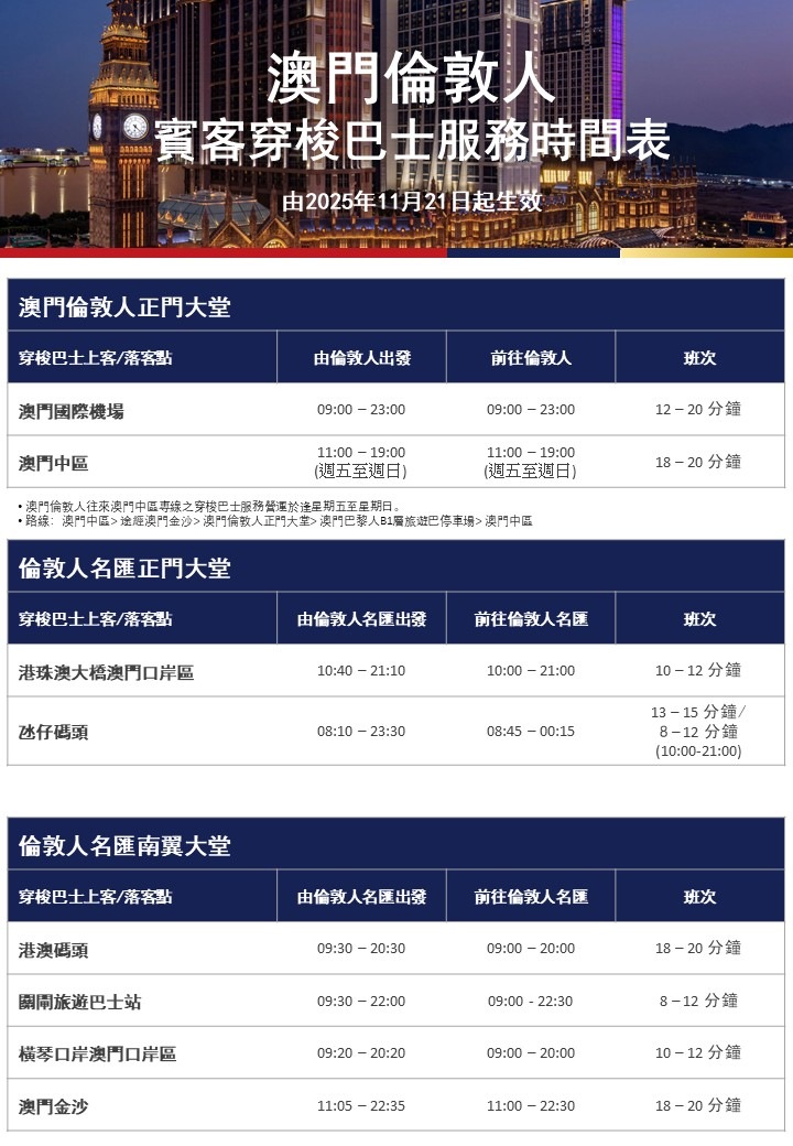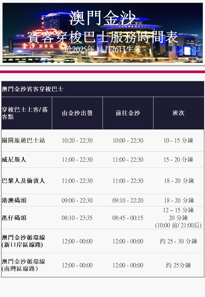 即日起,於澳門金沙,澳門威尼斯人及澳門倫敦人均設有直通車往返香港佐敦。每日往返有10班次,點擊查看巴士時間表。