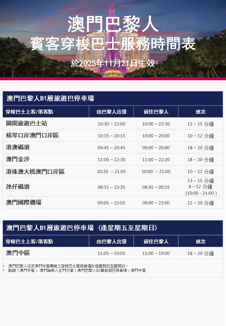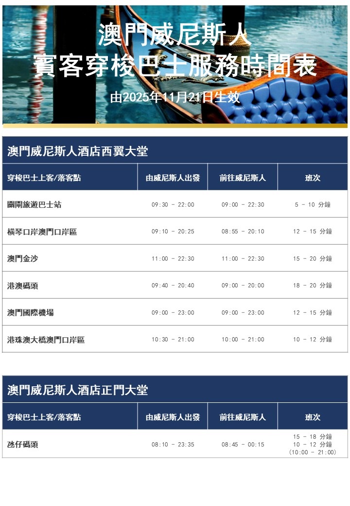 如欲查詢及購票,歡迎到各酒店上車點或致(853) 8118 2933 聯絡澳門威尼斯人金光旅遊了解更多詳情。